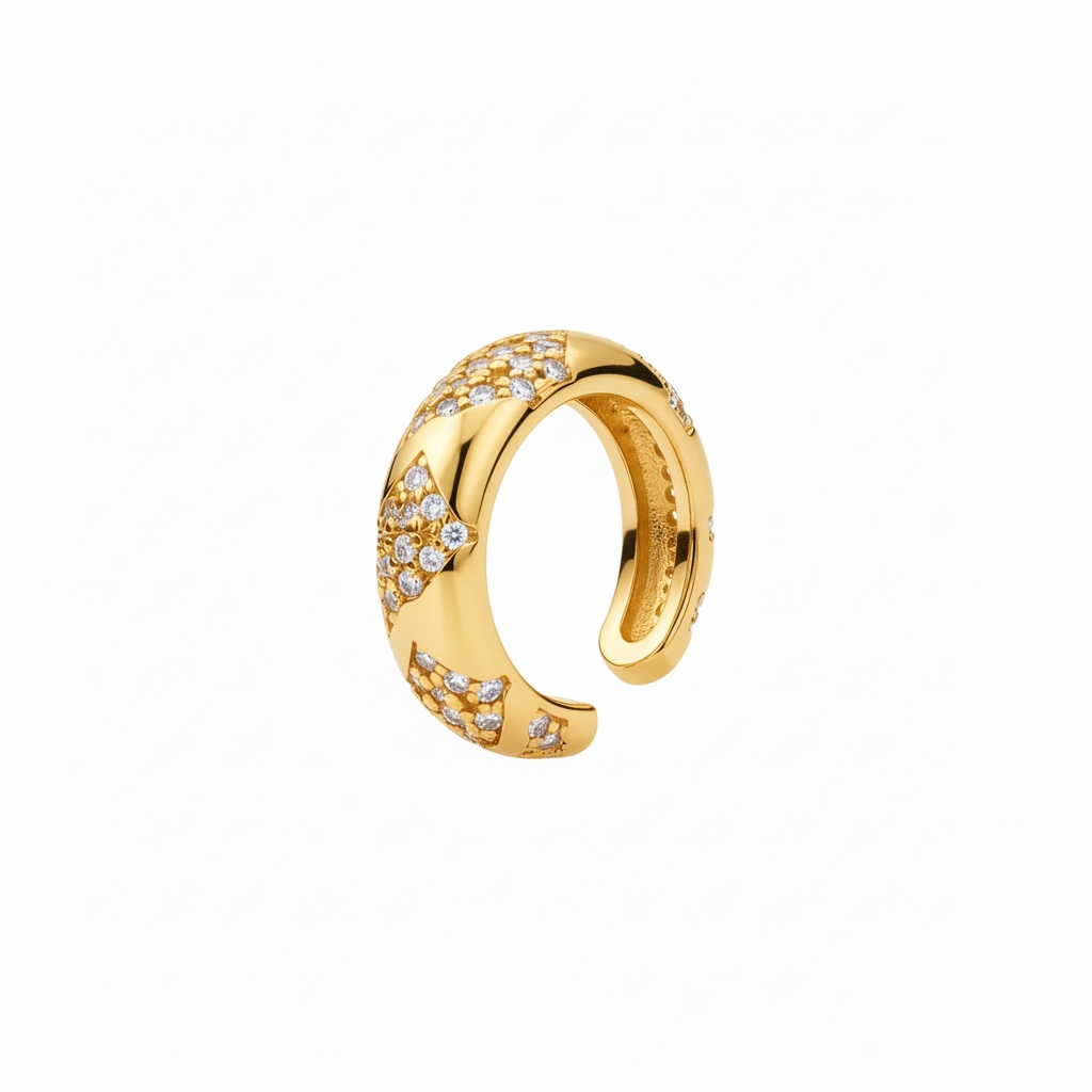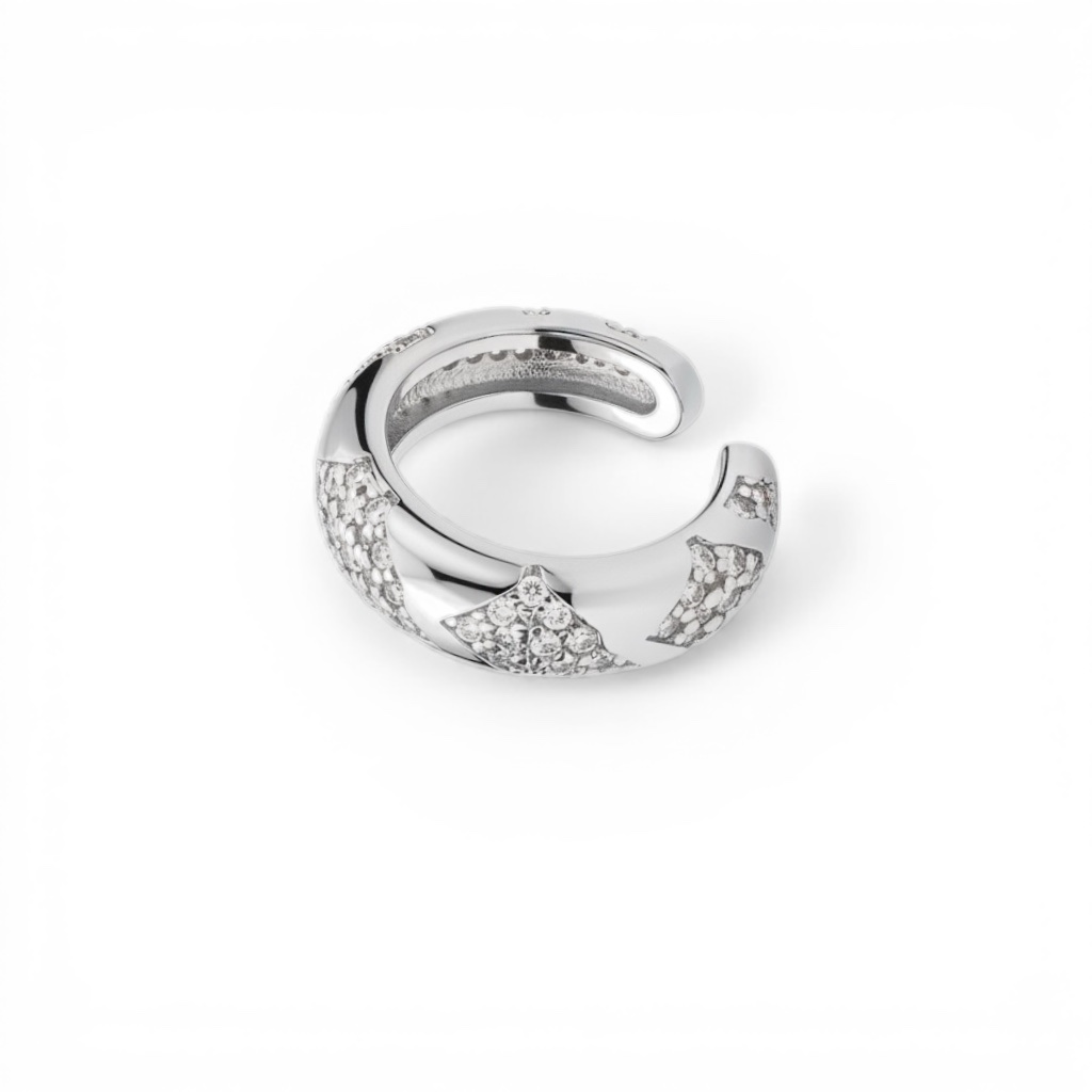 עגיל חישוק פתוח בעיצוב יוקרתי עם שיבוץ זירקונים נוצצים וצורת כוכבים. ניתן לענוד כעגיל קלאסי או כ-ear cuff אופנתי. זמין בציפוי זהב, רוזגולד או כסף.