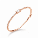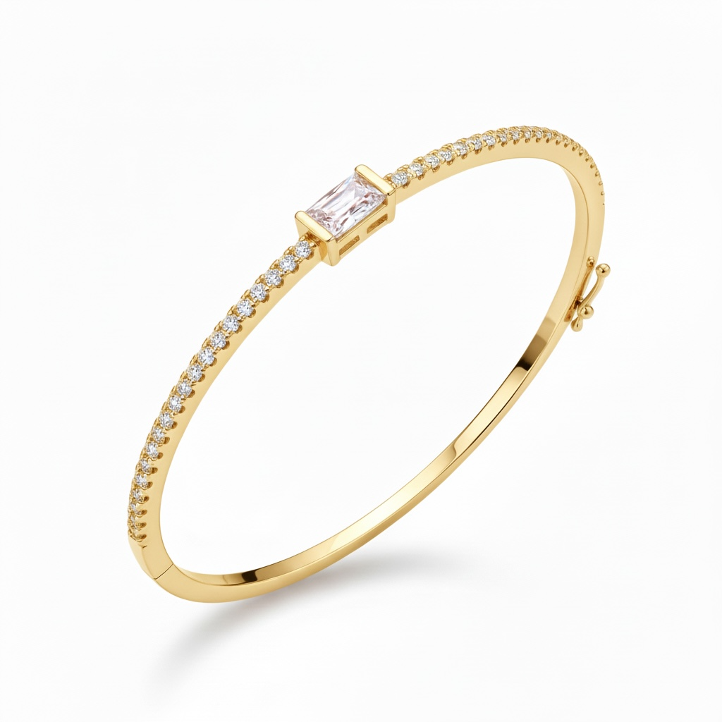 צמיד קשיח בעיצוב אבן מרכזית מלבנית נוצצת ושיבוץ אבנים לאורך הצמיד. משלב קו אלגנטי ועדין שיוצרים ברק יוקרתי ומראה נקי ומדויק.